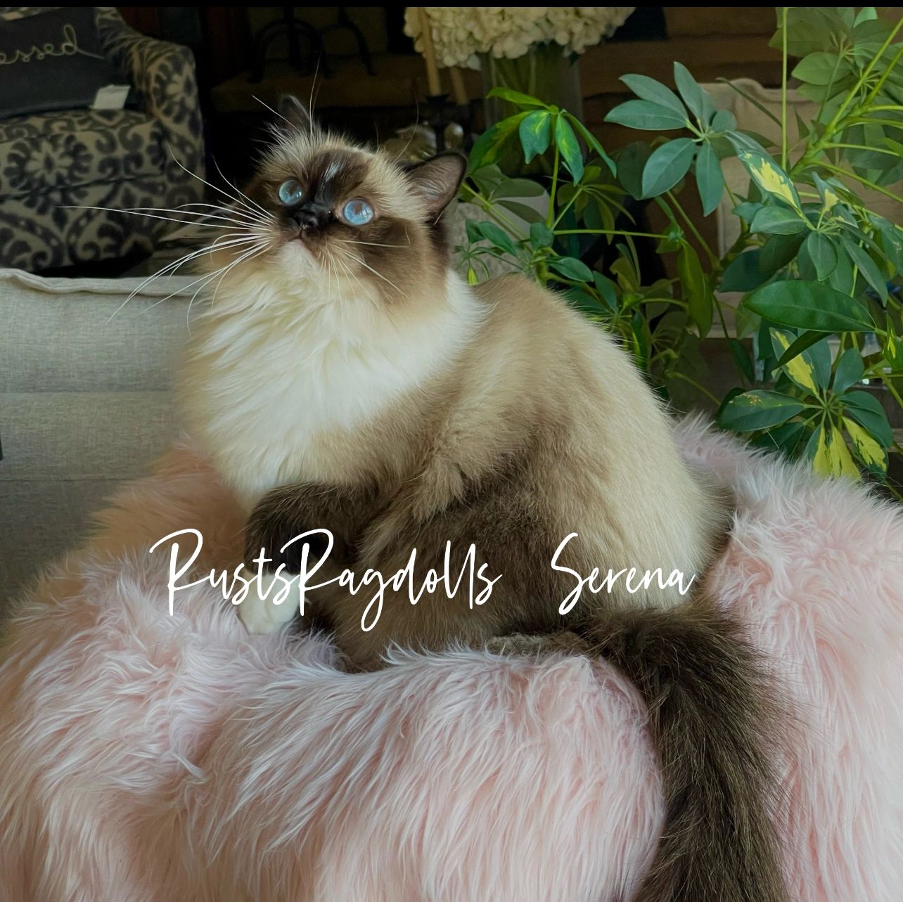 Rusts Ragdolls MiMi is our beautiful solid TICA registered queen she carries chocolate and the mink gene she is such a beautiful girl that gives us our stunning back and chocolate solid kittens. She has the biggest eyes with an amazing plush coat.